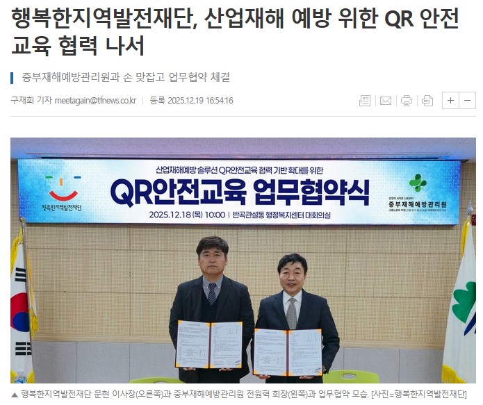 (조세금융신문=구재회 기자) 행복한지역발전재단과 중부재해예방관리원 주식회사가 산업재해 예방과 안전교육 협력 기반 확대를 위해 손을 맞잡았다.